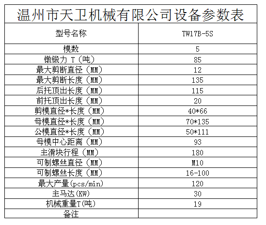 您當(dāng)前的位置:首頁 / 產(chǎn)品中心 / 五模五沖多工位冷鐓機 / └ TW17B(M10)多工位冷鐓機 / TW17B-5S全自動多工位冷鐓機